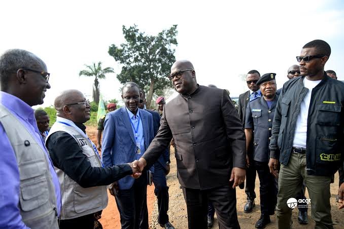 En présence de l’infatigable Ministre John Banza, le Directeur Général de l’ACGT Nico ́zau stimule les sourires du Chef de l’État Felix AntoineTshisekediTshilombo. .